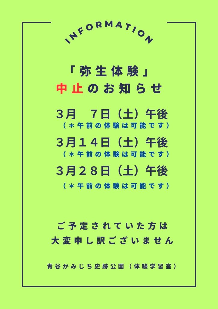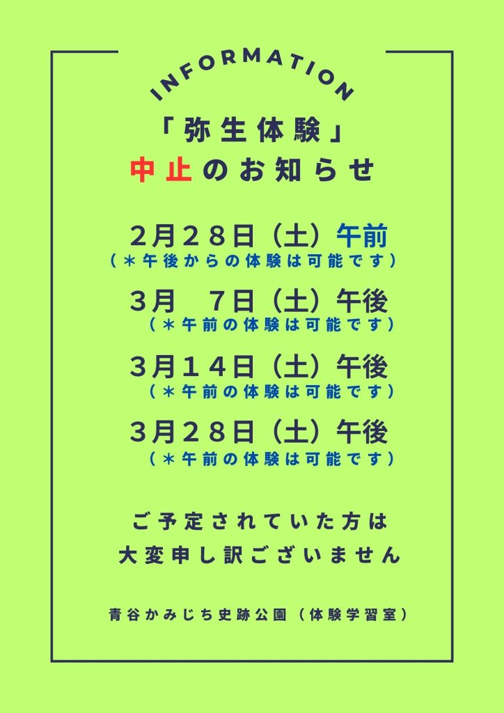 弥生体験中止のお知らせ