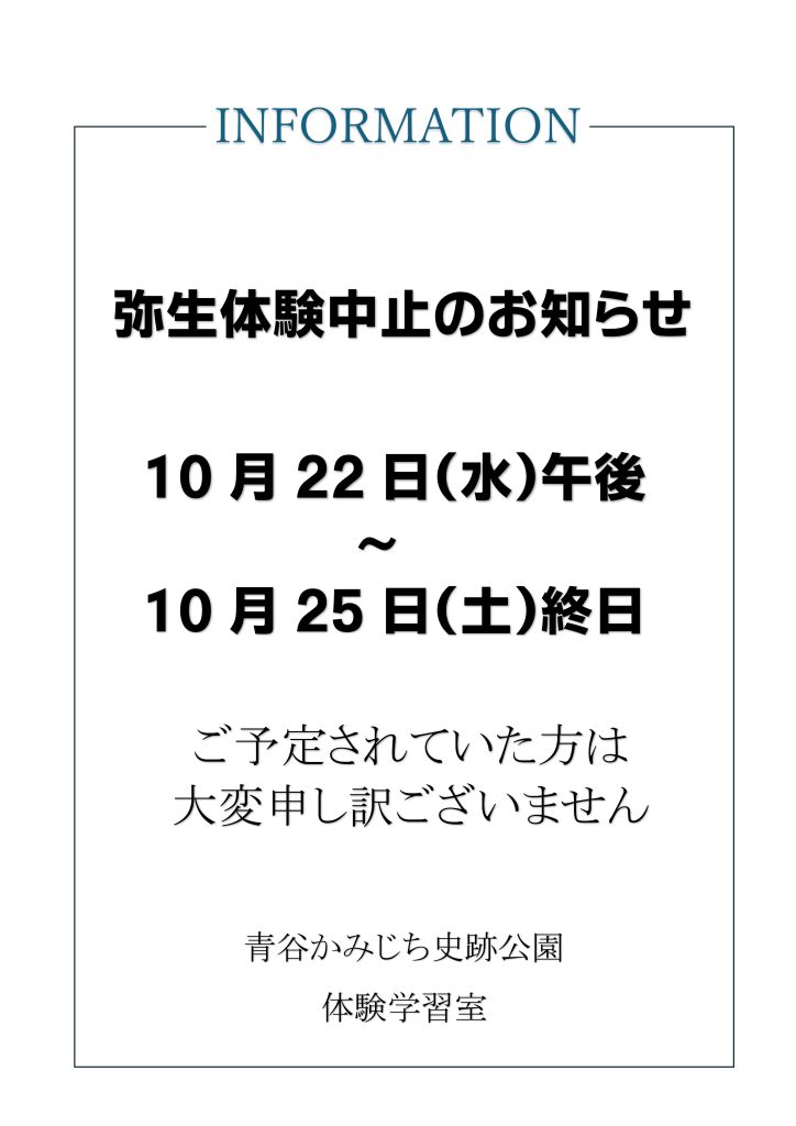 10月22日(水)午後~25日(土)終日の弥生体験は中止となります