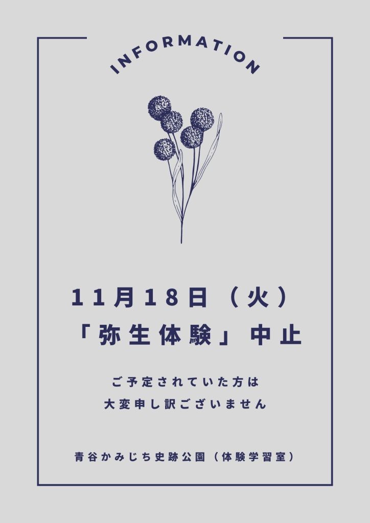 11月18日 弥生体験中止のお知らせ