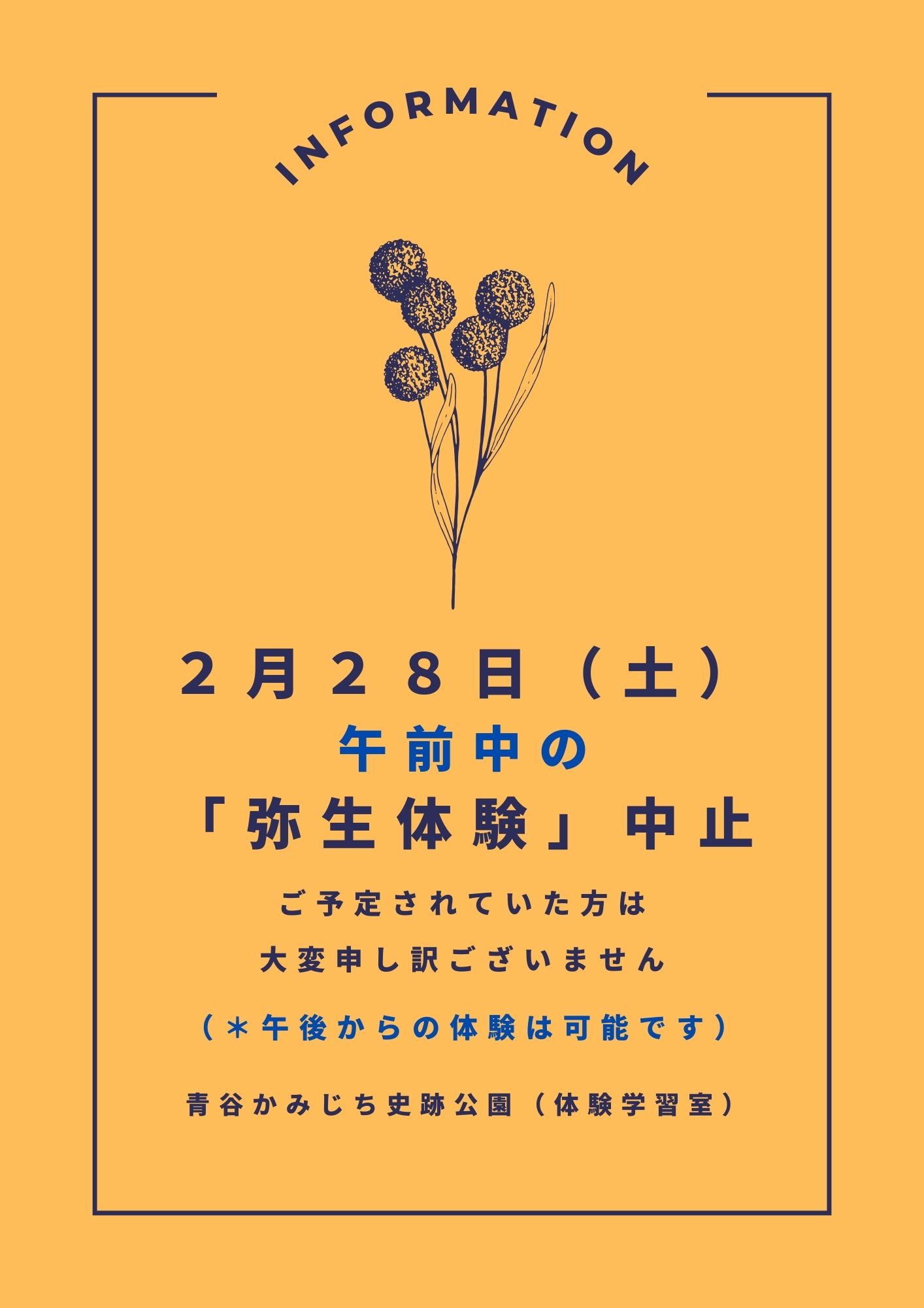 弥生体験中止のお知らせ「2/28(土)午前中」