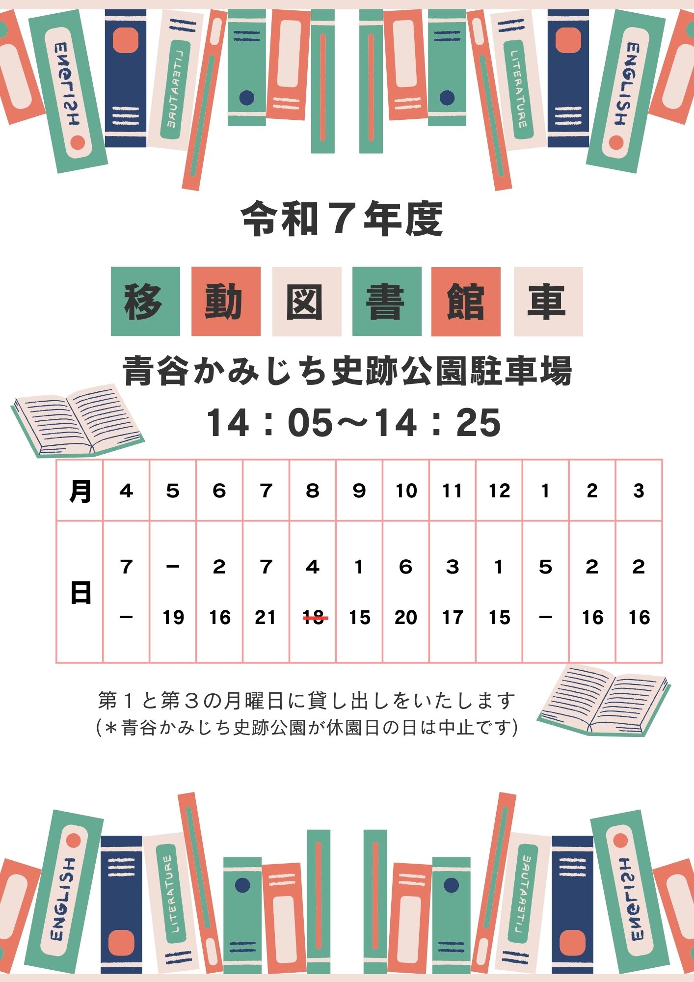 青谷かみじち史跡公園の駐車場にて14:05~14:25の時間で図書の貸し出しができます。