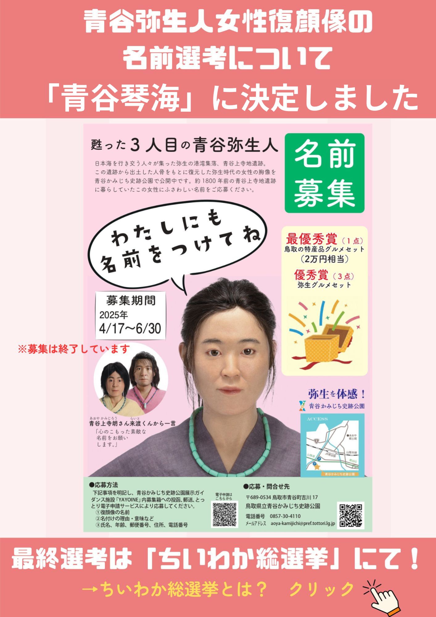 10月6日、鳥取県ちいわか総選挙の開票速報があり、一番多くの票を獲得した「青谷琴海(ことみ)」が女性復顔像の名前に決定しました。