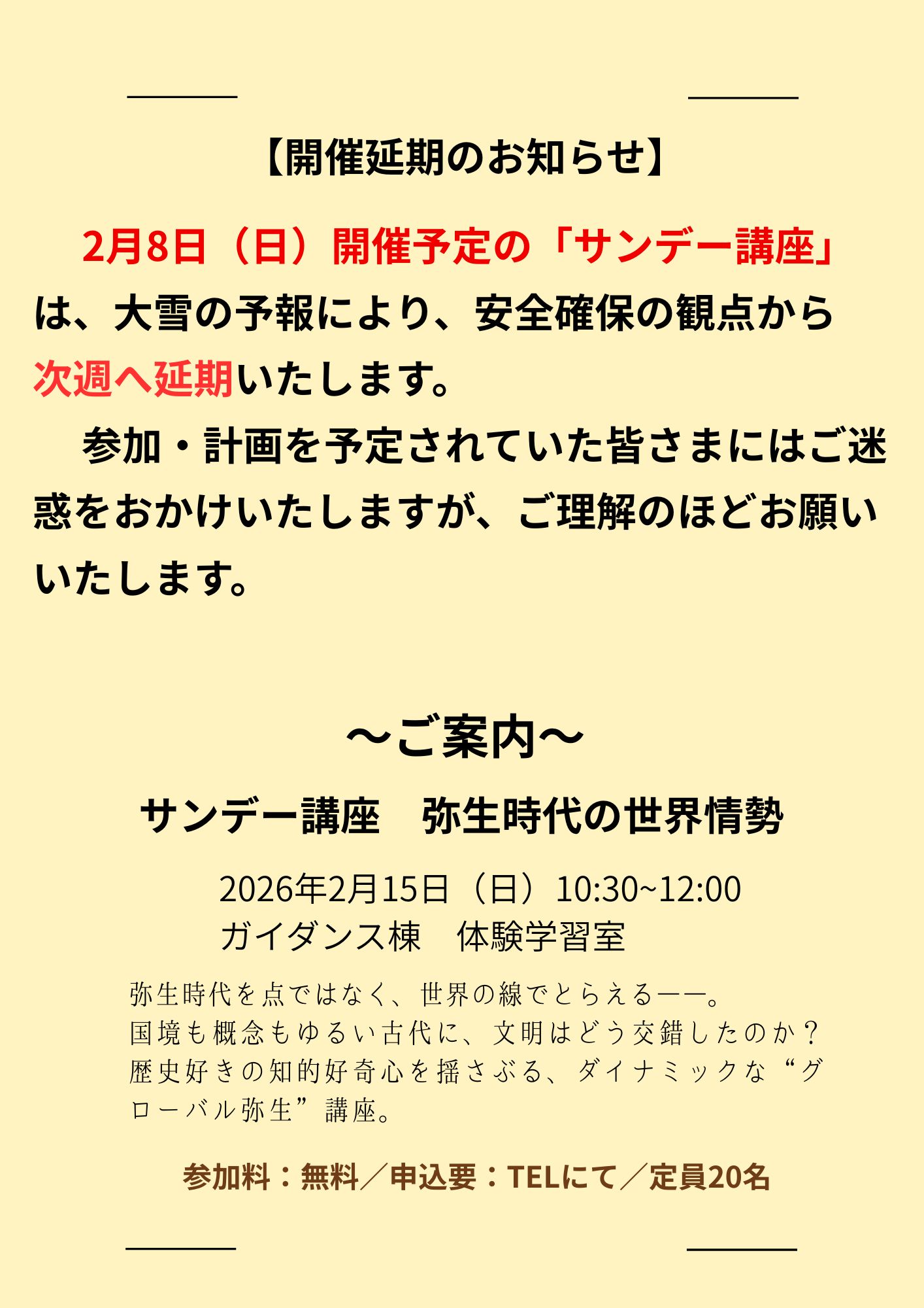 【開催延期のお知らせ】2月8日(日)開催予定の「サンデー講座」は、大雪の予報により、安全確保の観点から次週へ延期いたします。参加・計画を予定されていた皆さまにはご迷惑をおかけいたしますが、ご理解のほどお願いいたします。
