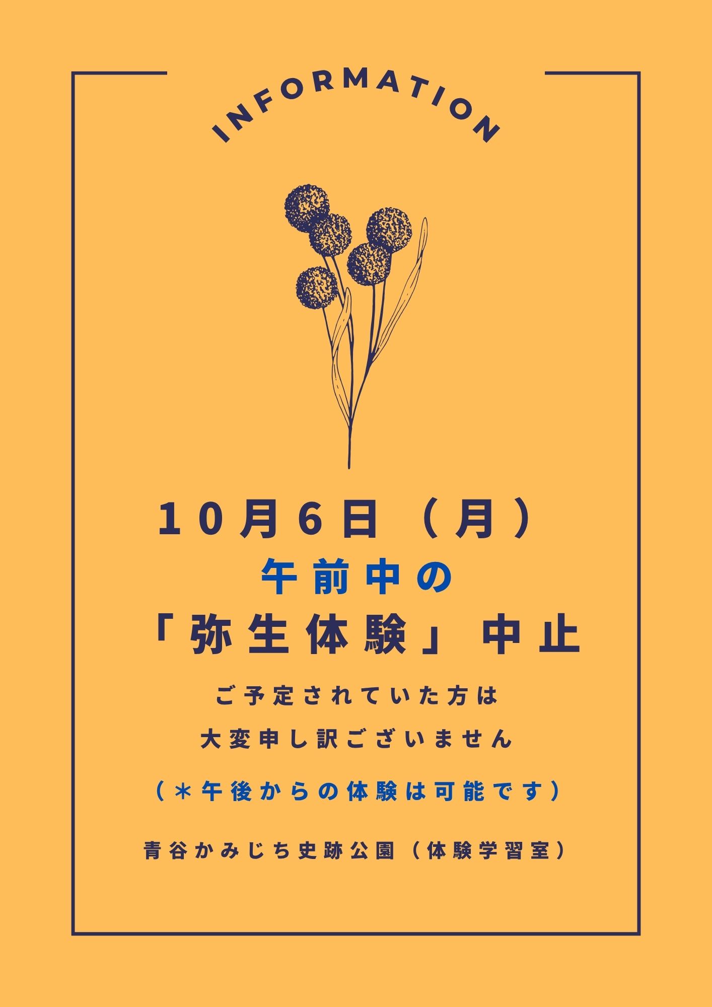 10月6日(月)午前中の弥生体験は中止となります。